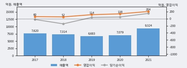 최근 실적을 살펴보면 2021년 매출액이 최근 5년 중 가장 높은 실적을 기록했음을 알 수 있다. 이전 최고 실적이었던 2017년 보다도 22.4%(1703억 8천만원) 늘어난 것으로 나타났다.