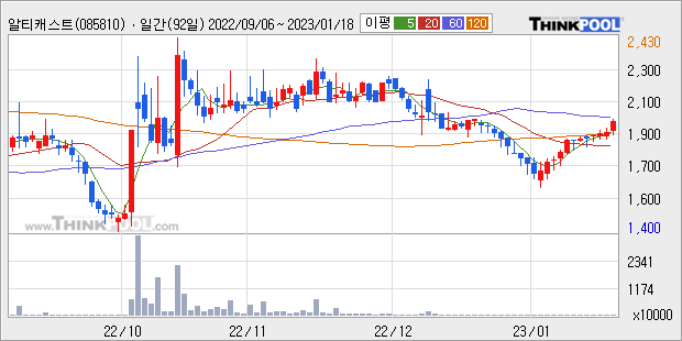 알티캐스트의 2021년 매출액은 전년대비 -18.7% 줄어든 362억원이고, 영업이익은 흑자전환해서 28억원을 기록했다. 이 회사의 매출액 증감률과 영업이익 증감률은 각각 코스닥 하위 11%, 상위 8%에 해당된다.