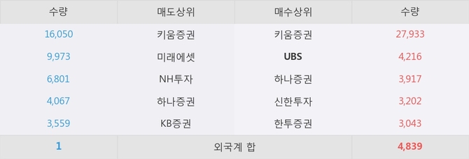 UBS이 매수상위 창구 2위를 기록중이고, 그 외에 키움증권, 하나증권 등이 매수 창구 상위에 위치하고 있다.