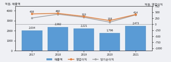 최근 실적을 살펴보면 2021년 매출액이 최근 5년 중 가장 높은 실적을 기록했음을 알 수 있다. 이전 최고 실적이었던 2018년 보다도 3.8%(90억 9천만원) 늘어난 것으로 나타났다.