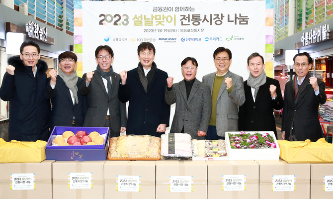 19일 금융감독원에 따르면 이날 금융감독원, KB국민은행, 미래에셋증권, 신한라이프, 우리카드 등 5개 기관이 명절을 앞두고 국제구호단체인 희망친구 기아대책과 함께 서울 영등포구에 위치한 영등포전통시장을 방문해 공동으로 마련한 후원금으로 생필품을 구입해 영등포구 관내 사회복지단체 4곳에 전달했다.