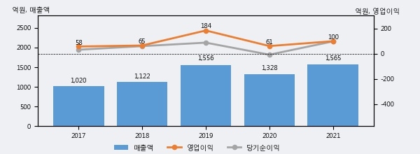 최근 실적을 살펴보면 2021년 매출액이 최근 5년 중 가장 높은 실적을 기록했음을 알 수 있다. 이전 최고 실적이었던 2019년 보다도 0.5%(8억 3천만원) 늘어난 것으로 나타났다.