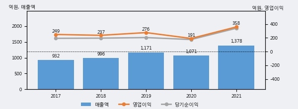 최근 실적을 살펴보면 2021년 매출액이 최근 5년 중 가장 높은 실적을 기록했음을 알 수 있다. 이전 최고 실적이었던 2019년 보다도 17.8%(207억 8천만원) 늘어난 것으로 나타났다.