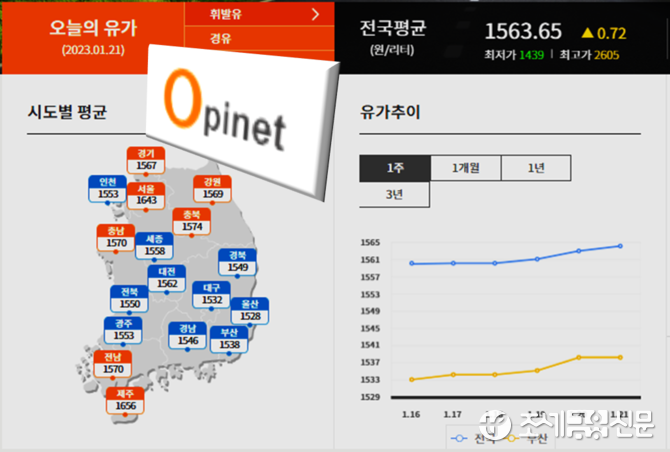 21일 한국석유공사 유가정보시스템 오피넷에 따르면 1월 셋째 주(15∼19일) 전국 주유소 휘발유 평균 판매가격은 L(리터)당 1천560.2원으로 전주보다 1.8원 내렸다.