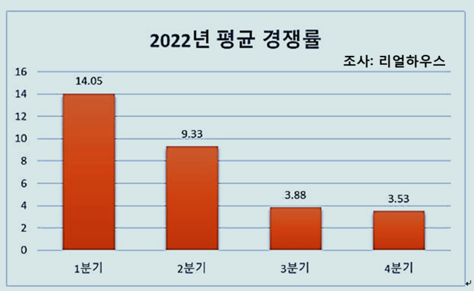 6일 분양 평가 전문회사 리얼하우스가 청약홈의 지난해 민영아파트 분양 경쟁률을 조사한 결과, 전국 1순위 평균 경쟁률은 6.8대 1로, 전년 대비 12.5% 하락했다. 특히 잇따른 금리 인상과 부동산 심리 악화로 청약 경쟁률은 분기가 지날수록 떨어졌다.