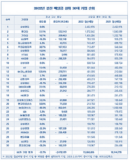 현대차와 기아의 2022년도 결산 배당은 각각 1조5천725억원, 1조4천32억원으로 2, 3위를 차지했다. 4대 금융지주 가운데 KB금융과 신한지주는 배당액이 각각 33.8%, 39.1% 감소했다. 우리금융지주와 하나금융지주는 각각 30.7%, 6.3% 증가한 배당금을 발표했다.