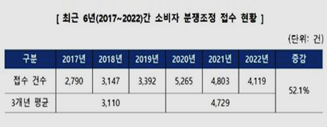 최근 3년(2020∼2022년) 접수된 소비자 분쟁조정 신청은 연평균 4천729건으로 지난 3년(2017∼2019년)에 비해 52.1% 증가했다.