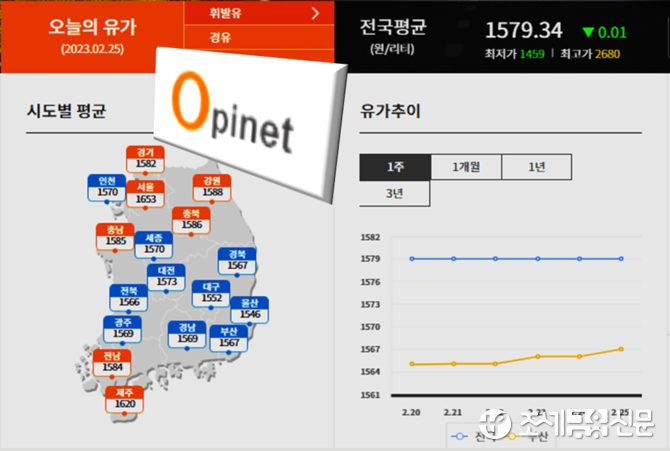 25일 한국석유공사 유가정보시스템 오피넷에 따르면 2월 4주(19∼23일) 전국 주유소 휘발유 평균 판매가격은 L(리터)당 1,579.1원으로 전주보다 1.7원 올랐다. 주간 단위로 지난주에 소폭 내렸다가 다시 강보합세로 전환했다.
