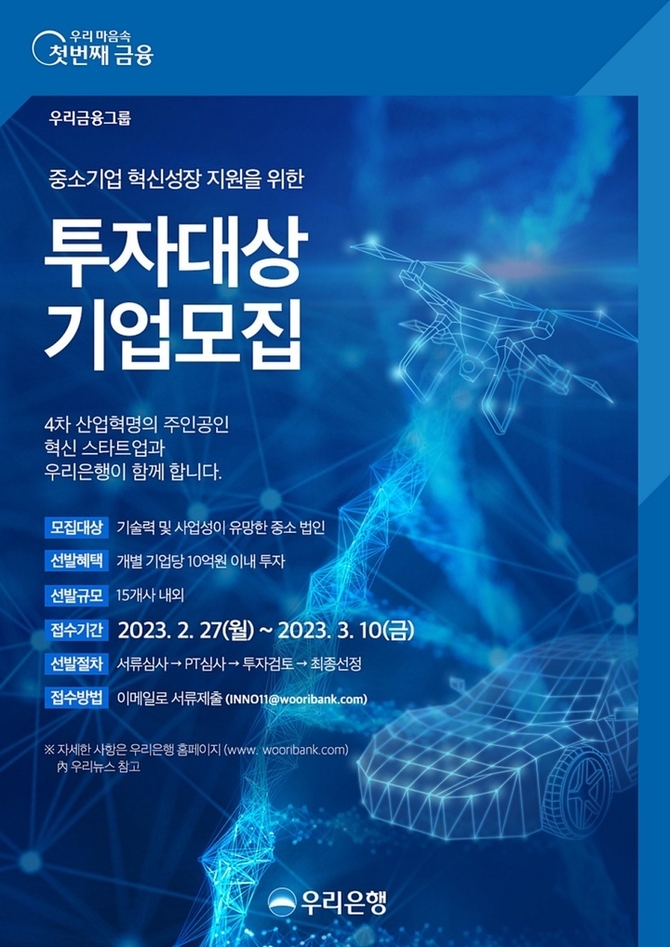 우리은행은 기술성, 사업성 평가 등의 내부 심사 단계를 거쳐 올해 6월까지 약 15곳 내외의 투자 대상기업을 선정할 예정이다. 상환전환우선주(RCPS) 등의 방식으로 각 기업에 10억원 이내의 자금을 투자할 계획이다.