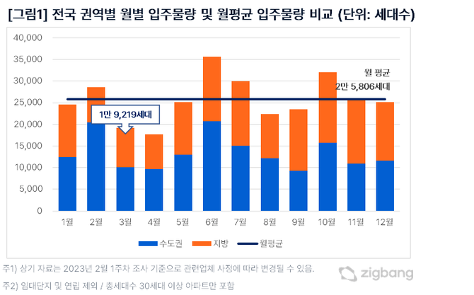 27일 부동산 플랫폼 직방에 따르면 3월 전국 아파트 입주 물량은 1만9219가구다. 올해 월평균 입주물량 2만5806가구와 비교하면 26%가량 감소한 수치다.