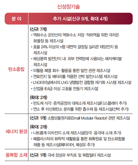 기존 분야에선 나트륨계 이차전지 소재 제조시설(양극·음극재 소재 추가), 폐플라스틱의 화학적 재활용을 통한 화학원료 및 탄소화합물 제품 등 제조시설(폐타이어, 폐섬유 추가)이 확대됐다.