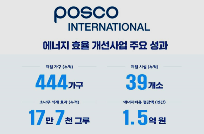 (조세금융신문=송기현 기자) 포스코인터내셔널은 지난 12년간 추진해온 취약계층 대상 에너지 효율 개선 사업을 통해 매년 1억5천만원의 에너지 비용을 절감하고 있으며, 이를 통해 감축한 이산화탄소 배출량은 누적 69만㎏으로 소나무 18만그루를 새롭게 심은 것과 같다고 5일 밝혔다.