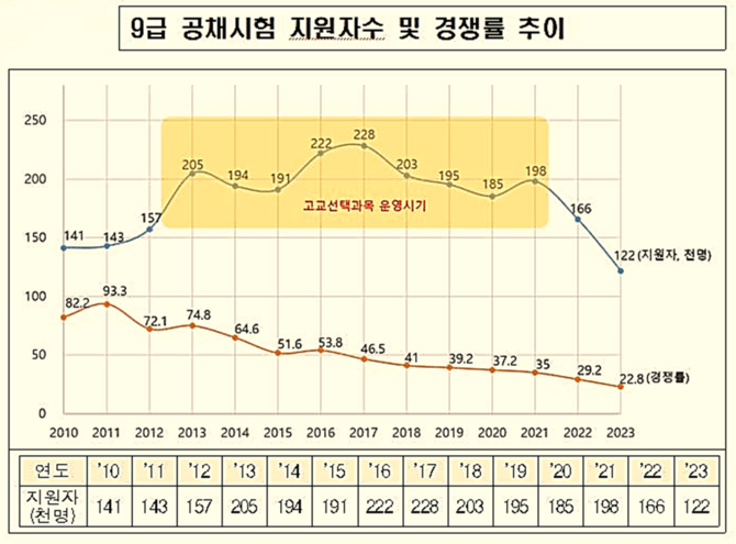 올해 지원자 수는 작년 16만5천524명에 비해 4만3천998명(26.6%)이 급감했는데, 인사처는 공채시험 경쟁률이 하락하는 이유로 고교선택과목 폐지, 학령인구 감소 등을 꼽았다.