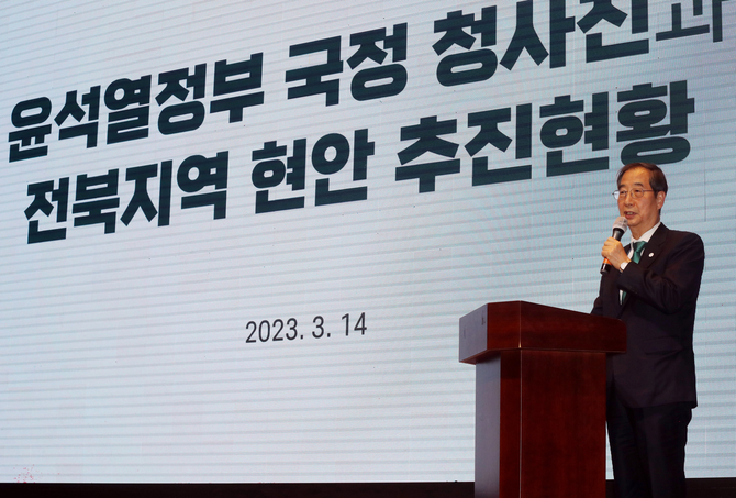 한덕수 국무총리는 14일 오후 전북 전주시 그랜드힐스턴호텔에서 '윤석열 정부 국정 청사진과 전북지역 현안 추진현황'을 주제로 한 특강에서 국정 운영 방향을 설명하면서 이같이 말했다.