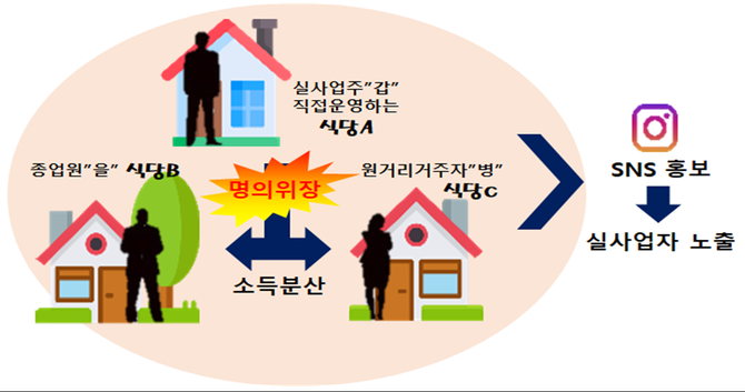 □□□는 자신의 SNS에 본인 사업장과 차명 사업장을 홍보하고, ○○○이 원거리에서 직장생활을 하고 있어 음식점 운영이 어렵다고 올렸다.