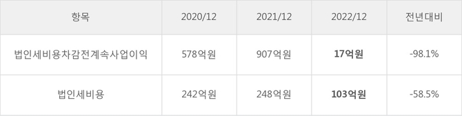 씨에스윈드의 지난 3년 동안 법인세 납부액 추이를 보면 2021년에는 증가했으나, 작년에는 103억원으로 크게 감소했다.