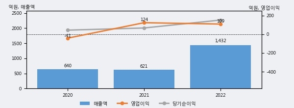 최근 실적을 살펴보면 2022년 매출액이 최근 3년 중 가장 높은 실적을 기록했음을 알 수 있다. 이전 최고 실적이었던 2020년 보다도 123.6%(791억 7천만원) 늘어난 것으로 나타났다.