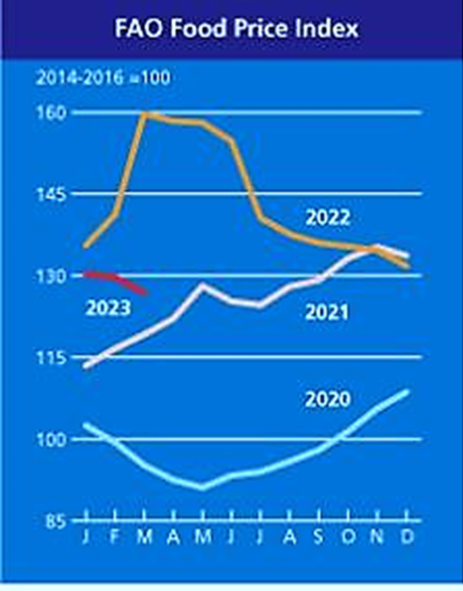(조세금융신문=최주현 기자) 세계 식량 가격이 지난해 3월 159.7로 최고치를 기록한 이후 12개월째 하락세를 나타냈다.