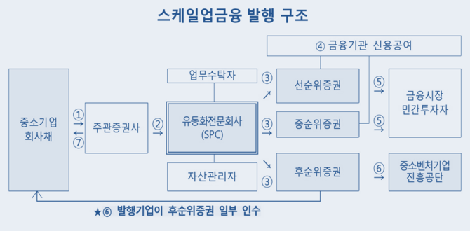 스케일업금융은 자체 신용으로 회사채 발행이 어려운 중소기업이 회사채를 발행해 자금을 조달하고 이를 통해 스케일업(성장)할 수 있도록 지원하는 사업이다.
