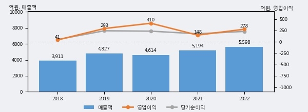 최근 실적을 살펴보면 2022년 매출액이 최근 5년 중 가장 높은 실적을 기록했음을 알 수 있다. 이전 최고 실적이었던 2021년 보다도 7.8%(403억 9천만원) 늘어난 것으로 나타났다.