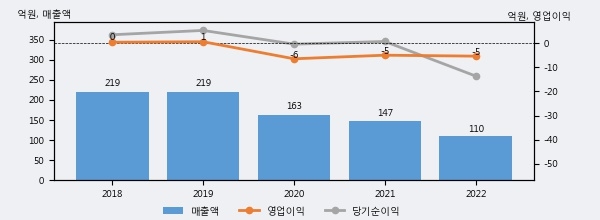 태원물산은 2022년 매출액 110억원과 영업이익 -5억원을 기록했다. 전년대비 매출은 -25.6% 하락했고, 영업이익은 전년에 이어 적자가 지속됐다. 이 회사의 매출액 증감률과 영업이익 증감률은 각각 코스피 하위 3%, 하위 45%에 해당된다.