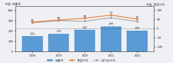 일신바이오는 2022년 매출액 204억원과 영업이익 51억원을 기록했다. 전년대비 매출은 -16.2%, 영업이익은 -30.0% 각각 하락했다. 이 회사의 매출액 증감률과 영업이익 증감률은 각각 코스닥 하위 14%, 하위 33%에 해당된다.