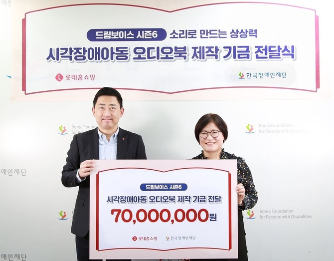 19일 롯데홈쇼핑은 전날 시각장애 아동을 위한 음성도서 제작사업 '드림보이스' 기부금 7천만원을 한국장애인재단에 전달했다고 밝혔다.