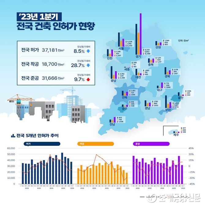 1일 국토부에 따르면 '23년 3월말 기준 전국의 허가 면적은 37,181천㎡로 다세대주택, 다가구주택 등의 허가 면적 감소로 인해 전년 동기(40,656천㎡) 대비 3,475천㎡ 줄었고, 동수는 36,447동으로 전년 동기(46,550동) 대비 10,103동 감소했다.