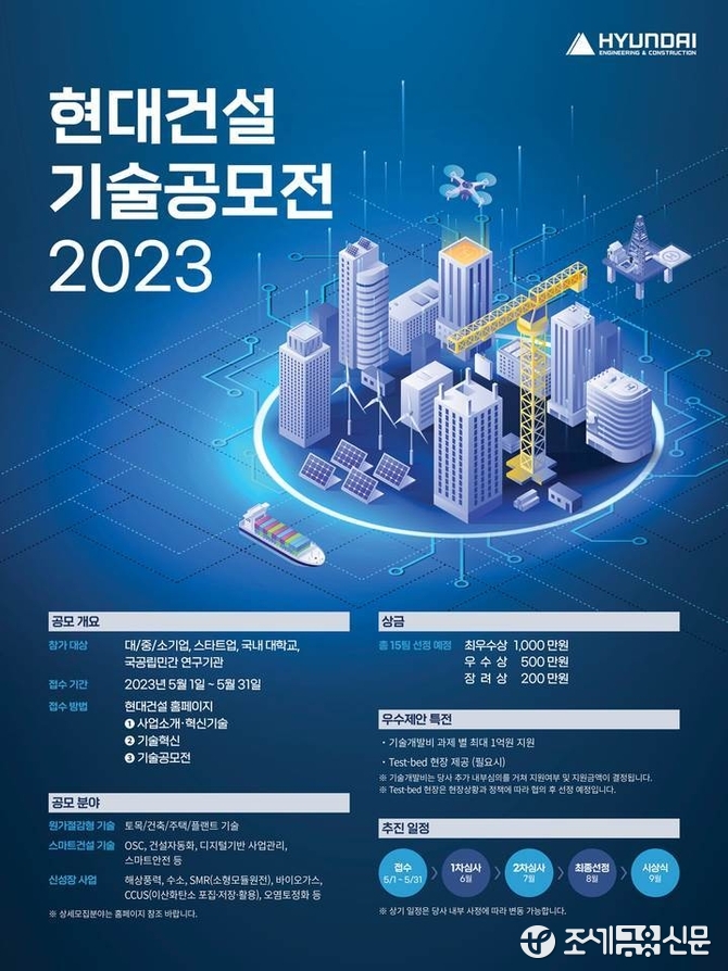 (조세금융신문=구재회 기자) 현대건설은 건설산업의 미래 성장동력을 발굴하기 위해 '2023 현대건설 기술 공모전'을 개최한다고 1일 밝혔다.