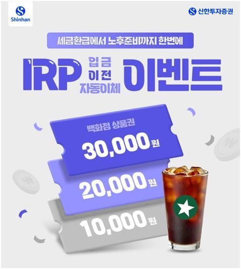 신한투자증권은 IRP 계좌에 매달 25만원 이상 자동이체를 등록한 고객 전원에게 커피 쿠폰을 지급한다. IRP 입금·이전·자동이체 이벤트는 각각 중복 참여가 가능하다. 다만, 모든 혜택은 3만원을 넘을 수 없다.