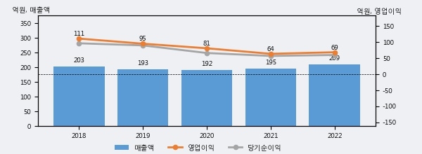 최근 실적을 살펴보면 2022년 매출액이 최근 5년 중 가장 높은 실적을 기록했음을 알 수 있다. 이전 최고 실적이었던 2018년 보다도 3.2%(6억 5천만원) 늘어난 것으로 나타났다.