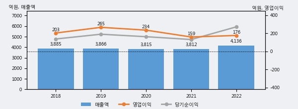 최근 실적을 살펴보면 2022년 매출액이 최근 5년 중 가장 높은 실적을 기록했음을 알 수 있다. 이전 최고 실적이었던 2018년 보다도 6.5%(251억 1천만원) 늘어난 것으로 나타났다.