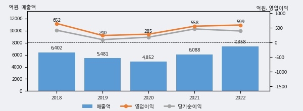 최근 실적을 살펴보면 2022년 매출액이 최근 5년 중 가장 높은 실적을 기록했음을 알 수 있다. 이전 최고 실적이었던 2018년 보다도 14.9%(956억 2천만원) 늘어난 것으로 나타났다.