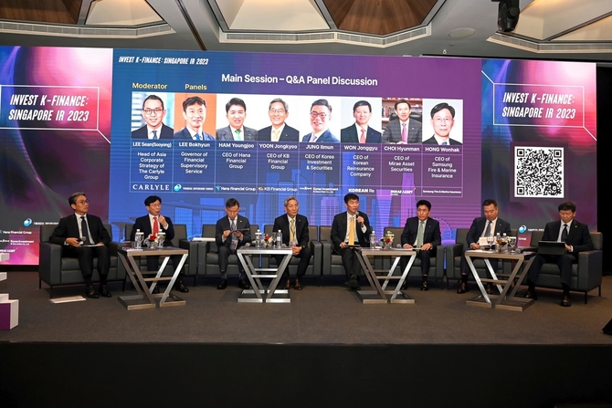 이날 싱가포르 해외 IR에서는 윤종규 KB금융그룹 회장, 함영주 하나금유그룹 회장, 최현만 미래에셋증권 회장, 정일문 한국투자즈권 사장, 홍원학 삼성화재 대표이사, 원종규 코리안리 대표이사 등 6개 금융회사 대표단과 한국 대사관, 국민연금, 글로벌 투자회사 임직원 등 200여명이 참석했다.