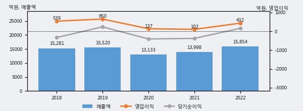 최근 실적을 살펴보면 2022년 매출액이 최근 5년 중 가장 높은 실적을 기록했음을 알 수 있다. 이전 최고 실적이었던 2019년 보다도 2.2%(334억 3천만원) 늘어난 것으로 나타났다.