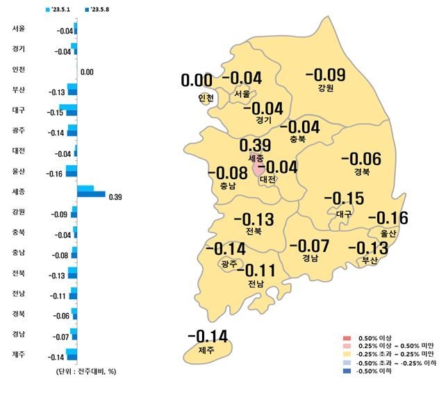 11일 한국부동산원에 따르면 5월 2주차(8일 기준) 서울 아파트 매매값은 0.04% 하락하며 지난주(-0.05%)에 비해 하락폭이 축소됐다. 서울 아파트 매매값은 지난 2월 첫 주(-0.31%) 이후 14주 동안 꾸준히 하락폭이 감소했다.