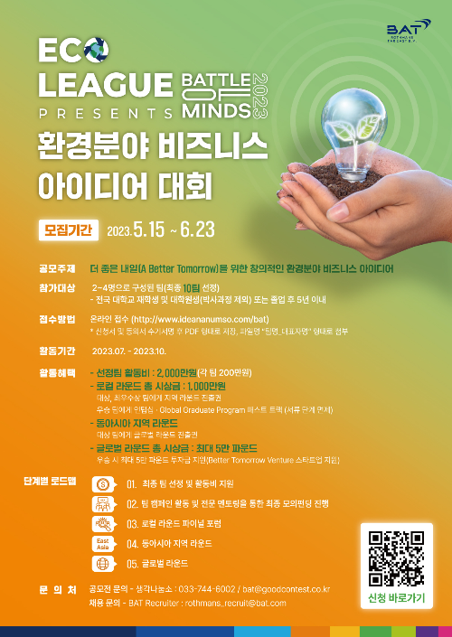 (조세금융신문=고승주 기자) BAT로스만스가 내달 23일까지 ‘대학생 환경 비즈니스 아이디어 공모전(Eco League X BoM)’을 개최한다.
