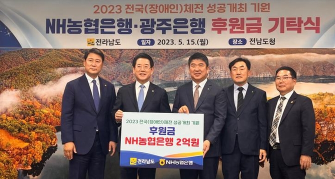 (조세금융신문=송기현 기자) NH농협은행 전남본부는 16일 전남도청에서 제104회 전국체전의 성공적인 개최를 위해 후원금 2억 원을 전달했다고 밝혔다.