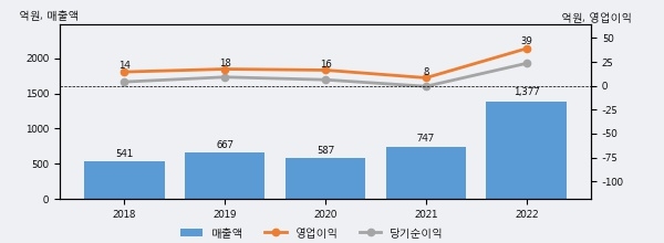 최근 실적을 살펴보면 2022년 매출액이 최근 5년 중 가장 높은 실적을 기록했음을 알 수 있다. 이전 최고 실적이었던 2021년 보다도 84.2%(629억 3천만원) 늘어난 것으로 나타났다.