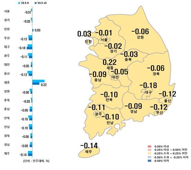 경기(-0.02%)도 용인 처인구(0.25%)·수지구(0.25%) 등이 높은 상승세를 보이면서 이번주 낙폭을 줄였다.