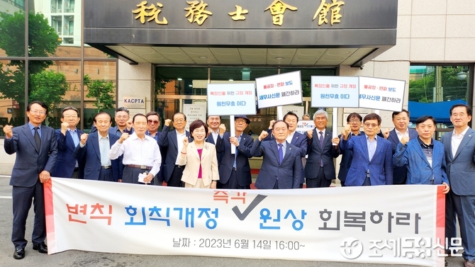 한편 이날 집회가 열린 한국세무사회관 앞에는 장한철 전 종로지역세무사회장이 '보궐선거 없애는 시도 거부한다'는 내용의 피켓을 들고 1인 시위를 진행하고 있었다.