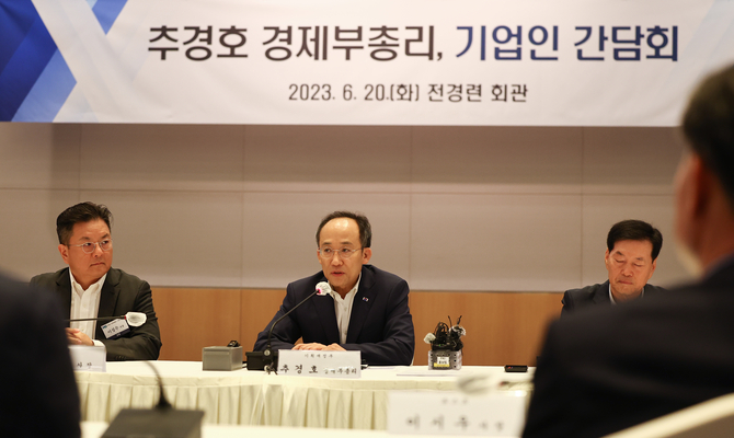 추 부총리는 인사말을 통해 “그동안 정부는 반도체 등 국가전략기술에 대한 세계 최고 수준의 세제지원, 경제 규제혁신 태스크포스(TF)를 통한 규제혁신 등을 추진해왔다. 앞으로도 기업하기 좋은 환경 조성과 경제활력 제고를 위해 총력을 다하겠다”고 전했다.