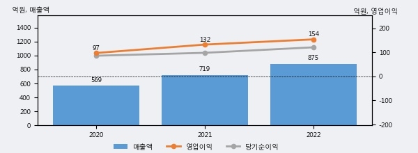 최근 실적을 살펴보면 2022년 매출액이 최근 3년 중 가장 높은 실적을 기록했음을 알 수 있다. 이전 최고 실적이었던 2021년 보다도 21.7%(155억 7천만원) 늘어난 것으로 나타났다.
