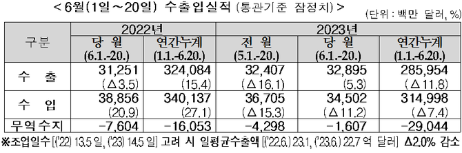 2021년 6월 1~20일 일평균 수출액은 20.9억 달러, 2022년 23.2억 달러, 그리고 올해 22.7억 달러를 기록했다.