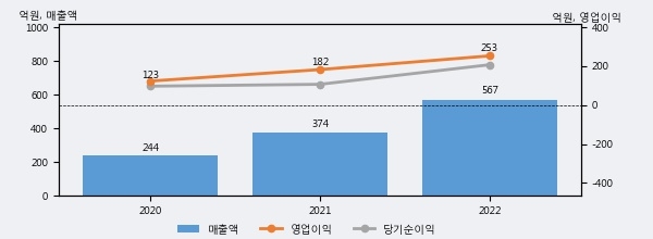 최근 실적을 살펴보면 2022년 매출액이 최근 3년 중 가장 높은 실적을 기록했음을 알 수 있다. 이전 최고 실적이었던 2021년 보다도 51.6%(193억원) 늘어난 것으로 나타났다.