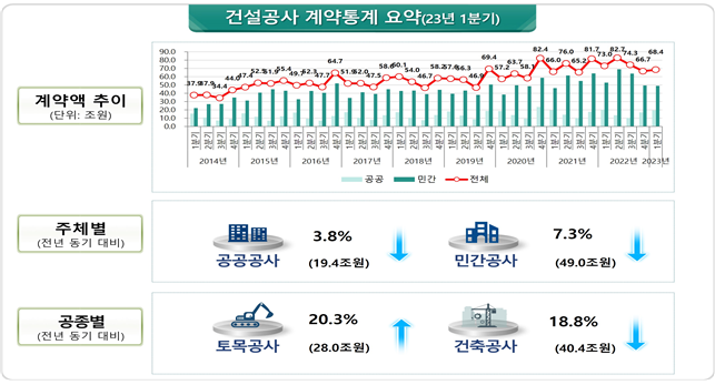 공사 주체별로 공공부문은 전년 동기 대비 3.8% 감소한 19조4000억원으로 나타났고, 민간 부문은 7.3% 줄어든 49조원으로 집계됐다.