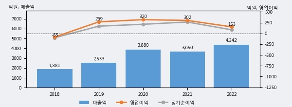 최근 실적을 살펴보면 2022년 매출액이 최근 5년 중 가장 높은 실적을 기록했음을 알 수 있다. 이전 최고 실적이었던 2020년 보다도 11.9%(461억 6천만원) 늘어난 것으로 나타났다.