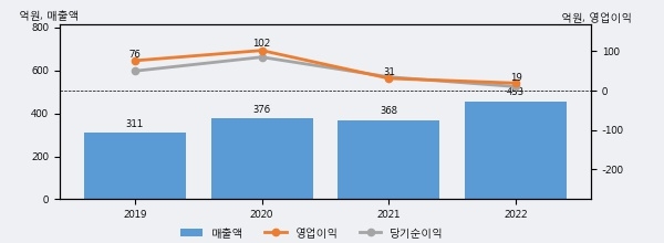 최근 실적을 살펴보면 2022년 매출액이 최근 4년 중 가장 높은 실적을 기록했음을 알 수 있다. 이전 최고 실적이었던 2020년 보다도 20.5%(77억 1천만원) 늘어난 것으로 나타났다.