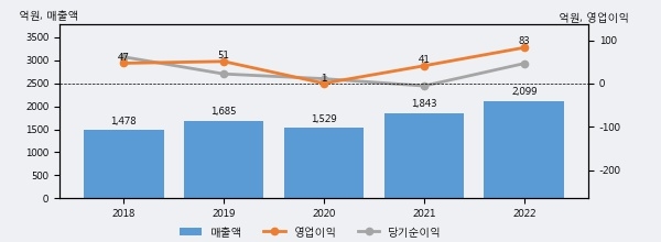 최근 실적을 살펴보면 2022년 매출액이 최근 5년 중 가장 높은 실적을 기록했음을 알 수 있다. 이전 최고 실적이었던 2021년 보다도 13.9%(255억 9천만원) 늘어난 것으로 나타났다.