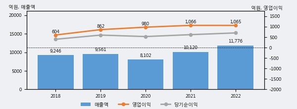 최근 실적을 살펴보면 2022년 매출액이 최근 5년 중 가장 높은 실적을 기록했음을 알 수 있다. 이전 최고 실적이었던 2021년 보다도 16.4%(1656억 5천만원) 늘어난 것으로 나타났다.